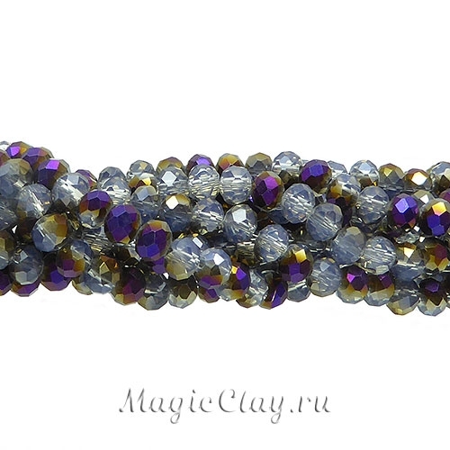 Бусины рондели граненые, стеклянные. Бусины прозрачные серого цвета. Пловина бусины с покрытием радужного пурпурно-золотого цвета. Грани красиво переливаются на свету.