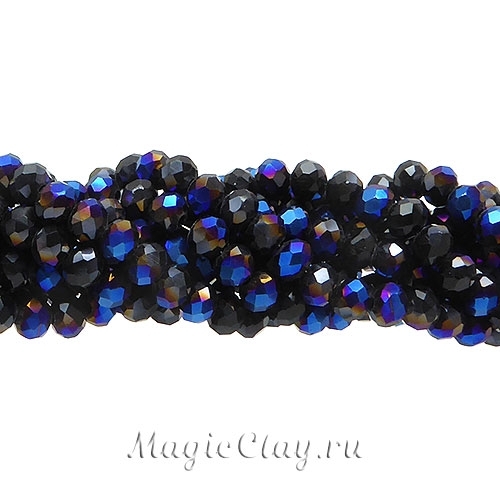 Бусины рондели граненые, стеклянные. Бусины непрозрачные чёрного цвета. Половина бусины с покрытием синего цвета металлик. Грани красиво переливаются на свету.