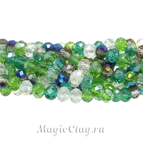 Бусины в форме ронделей. Бусины микс цветов - зелёный, прозрачный, малахит, серый с 1/2 синим покрытием металлик, зелёный. Цена указана за нить примерно 85 шт.