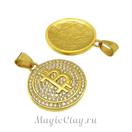 Подвеска из титановой стали марки 316L с изображением символа Биткоин с роскошными фианитами. В центре подвески объёмная вставка с глазом голубого цвета. С бейлом для подвешивания.